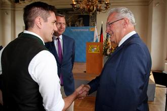 Innenminister Joachim Herrmann (re.), ehem. Staatssekretär des Bundesinnenministeriums Stephan Mayer und Bürgermeister Justus Pfeifer (li.) sichtlich erfreut über die Corona-Hilfen des Bundes“