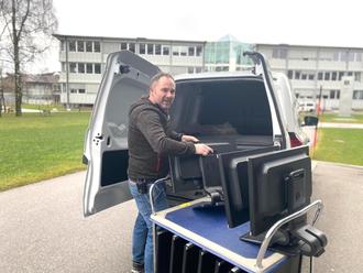 Christian Schulz, Leiter Kommunalunternehmen Gemeindewerke Ruhpolding, holte die 32 gespendeten Monitore von der Firma ab.