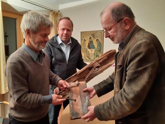 Alte Relikte vom bisherigen Pfarrkirchen-Dachstuhl wie handgeschmiedete Nägel, angefaulte Sparren und ausgediente Kirchenbiber präsentieren von links Pfarrer Otto Stangl, Hubert-Georg Braxenthaler von der Kirchenverwaltung sowie Pfarrgemeinderats-Vorsitzender Manfred Hartl
