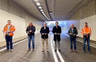 Im sanierten Schlosstunnel wurde das Ende der Baustellenmaßnahmen besiegelt. Daniel Kirchberger, Staatliches Bauamt Traunstein, Andreas Dieplinger, Fa. Streicher, Peter Maltan, Baudirektor des Staatliches Bauamt Traunstein, Bürgermeister Justus Pfeifer, Josef Kaiser, Staatliches Bauamt Traunstein und Ludwig Altanbauer, Staatliches Bauamt Traunstein, durchschneiden das Band und geben den Verkehr auf der neu sanierten Strecke von 2,4 km wieder frei (v.l.).