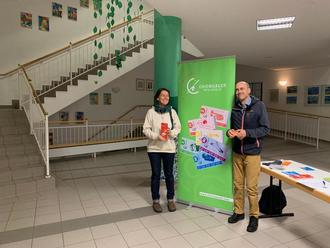 Chiemgauer-Team Elke Boehringer und Peter Fochler am Infostand in der Grund- und Mittelschule in Ruhpolding