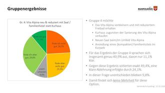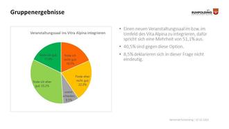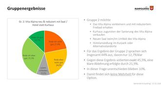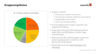 Die Auswertung der online-Befragung zeigt insgesamt, dass die Kernfrage – Aufgabe oder Erhalt des Kurhauses – die Herzen der Ruhpoldinger bewegt. Die Tendenz geht jedoch in Richtung Neubau eines neuen Saales und gleichzeitig für den Erhalt des Freibades. Die Mehrheit der Teilnehmer kann sich den neuen Festsaal im oder im Umfeld des Vita Alpina aufgrund der möglichen Synergieeffekte vorstellen. 40% finden diese Lösung nicht gut. Zudem hat die Gemeindeverwaltung wertvolle Vorschläge zum neuen Veranstaltungssaal, zur Kurparkgestaltung sowie zu anderen wichtigen Punkten zur Ortsgestaltung gewonnen. Die kompletten Ergebnisse werden im Rahmen einer knapp zweiwöchigen Ausstellung im Raum „Zeller Sepp“ im Bahnhofsgebäude präsentiert. Auch werden nochmal alle Lösungsvorschläge aus der Bürgerwerkstatt, die am 16.11.22 in der öffentlichen Veranstaltung im Pfarrzentrum bereits präsentiert wurden, gezeigt.