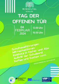Das Mindeltal-Gymnasium und die Mindeltal-Realschule laden ganz herzlich zum Tag der offenen Tür am 4. Februar 2024 ein. Verschaffen Sie sich ein eigenes Bild vom Unterricht in unseren modern ausgestatteten und schülerfreundlichen Räumlichkeiten. Unsere kompetenten Lehrkräfte freuen sich auf die Gespräche mit Ihnen.