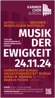 Am letzten Sonntag im Kirchenjahr wird in der römisch-katholischen Kirche das Christkönigsfest gefeiert, die evangelisch-lutherische Kirche begeht den Ewigkeits- bzw. Totensonntag. Die Thematik dieser Anlässe erscheint auf den ersten Blick gegensätzlich, bei weiterem Nachdenken offenbart sich aber die entscheidende Verbindung: die auf die Auferstehung bauende Gewissheit des christlichen Glaubens. Im Konzert des Kammerchor Burgau kommen Werke zur Aufführung, die diesen Zusammenhang verdeutlichen: