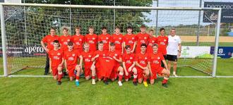 Auf dem Bild sind die A-Junioren mit Sponsor Reinhard Joas (links) und Coach Karsten Hahn (rechts)