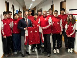 Auf dem Bild (Foto: Sven Arendt) sind einige der VfR-Spieler mit Gymnasium-Schulleiter Mustafa Üyrüs und VfR-Jugendleiter Jörg Hahn.