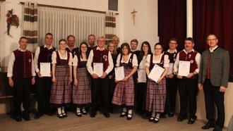 Ehrungen für langjähriges aktives Wirken und neugewählte Vorstandschaft von links: Alfred Walker (Dirigent), Christoph Brenner (20 Jahre Vorstandschaft), Sophie Walker (Beisitzerin), Hubert Frei (50 Jahre), Alina Reiter (Beisitzerin), Holger Rampp (Notenwart), Willi Zimmermann (60 Jahre), Manuela Miller (Kassenwartin), Josef Lukas (2. Vorstand), Karin Maier (50 Jahre), Maximilian März (Beisitzer), Carmen Reiter (30 Jahre Vorstandschaft), Julia Walker (15 Jahre und Beisitzerin), Peter Walker (50 Jahre), Erich Walker (50 Jahre und 1. Vorstand), Robert Strobel (ASM) Auf dem Bild fehlen Lea Bisle (15 Jahre aktiv und Beisitzerin) und Christiane Seibold (Schriftführerin)