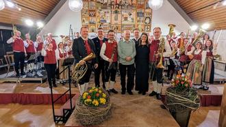 Bevor das Publikum mit dem Traditionsmarsch "Alte Kameraden" vom gekonnt und mit einigem Witz moderierenden Stadtpfarrer Simon Stegmüller in die Pause verabschiedet wurde, übergab er das Mikrofon an den Präsidenten des Allgäu-Schwäbischen Musikbundes Franz Pschierer für die Ehrungen. Für sein zehnjähriges Engagement als Vorsitzender seiner Handschuhmacher ehrte er nach einem flammenden Plädoyer für die Jugendausbildung in der Blasmusik den, nach Pschierers Aussage, "Vereinsmenschen durch und durch" Michael Fritz. Neben einer Urkunde sowie einer Anstecknadel war auch der große Applaus aus den Reihen der Musikerinnen und Musiker die verdiente Anerkennung. Zu den weiteren Geehrten gehörten Tobias Auinger für seinen 25-jährigen Einsatz in der Blasmusik, Robert Fischer, für seine bereits 50-jährigen Verdienste und das Ehrenmitglied der Handschuhmacher Hans Eska für die nicht alltägliche Auszeichnung zu 70-jährigem Engagement.