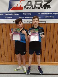 Emir Efe (links) sicherte sich beim Tischtennis - Bezirksentscheid der Minis den Titel bei den Jungen 9-10 Jahre den Titel. Mit drei 3:0 Erfolgen setzte er sich in seiner Gruppe souverän durch und konnte im Viertelfinale einen 0:2 Satzrückstand noch in einen 3:2 Erfolg umbiegen. Durch seinen unbedingten Siegeswillen setzte er sich auch im Halbfinale nach 1:2 Rückstand schließlich mit 3:2 durch ehe er im Finale mit einem 3:1 Erfolg gegen Samuel Safak aus Gessertshausen die Qualifikation perfekt machte. Bei den Jungen 11-12 Jahre ging Maxim Kusin (im Bild rechts) an die Platten. Auch er setzte sich mit klaren Erfolgen in der Vorrunde als erster durch und erreichte mit einem 3:1 Sieg im Viertelfinale und einem glatten 3:0 Erfolg im Halbfinale, das Endspiel. Hier musste er sich nach sehr guter Leistung jedoch dem Nördlinger Nachwuchstalent Noah Vescera mit 1:3 geschlagen geben und muss somit auf einen freien Platz in der Bayerischen Endrunde hoffen.