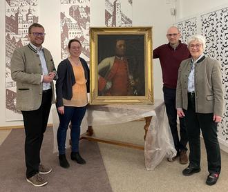 Über den Ankauf das Portrais von Georg Ferdinand von Braun des Günzburger Malers de la Pesterie durch den Historischen Verein Günzburg freuen sich v.l. der 1. Vorsitzende des Historischen Vereins Günzburg Stefan Baisch, Museumsmitarbeiterin Julya Berzen, Museumsleiter Dr. Raphael Gerhardt und die bisherige Besitzerin Elisabeth von Liel