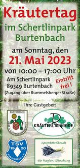 Ein buntes Fest für die Sinne, für Kräuter- und Küchenfans, für die ganze Familie - so lautet das Motto am Sonntag, den 21. Mai 2023 von 10 bis 17 Uhr im Schertlinpark in Burtenbach. Inzwischen hat sich der Kräutertag zu einer stimmungsvollen, begegnungsreichen und mit mehreren tausend Besuchern, zu einer reizvollen Veranstaltung etabliert. Die an die 50 ausgewählten Aussteller aus ganz Schwaben bieten keine Massenware, sondern kreatives aus eigener Werkstatt und vielfach handgefertigte Unikate zum Verkauf an. Die Besucher dürfen die vielfältige Welt der Kräuter, Rosen und Pflanzen erleben, von kulinarisch über kunsthandwerklich und kosmetisch bis kreativ.
