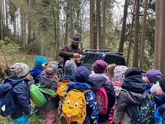 Die Kinder erforschten ausgiebig die Wälder und Wiesen rund um „Allerheiligen“. Ein Höhepunkt der Waldtage war der Besuch von den Jägern Uli Bauer und Max König mit ihren zwei Jagdhunden. Die Jäger versteckten zahlreiche Knochen, Federn und sogar ausgestopfte Tiere, die die Kinder anschließend suchen durften. Danach nahmen sich die Jäger Zeit die Fragen aller Kinder zu beantworten. Besonders beeindruckt waren wir über den Suchhund „Paula“, der das von den Kindern versteckte Kuscheltier- Wildschwein fand.