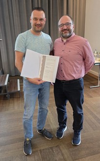 Beim Tischtennis - Bezirkstag in Mertingen wurde Benjamin Findler vom SV Unterknöringen (rechts im Bild)) besonders geehrt. Für seine Ehrenamtliche Tätigkeit als Abteilungsleiter wurde ihm vom Bezirksvorsitzenden Jürgen Klauser (links) die Ehrennadel des Bayerischen Tischtennis Verbandes in Bronze und die dazu gehörige Urkunde überreicht.