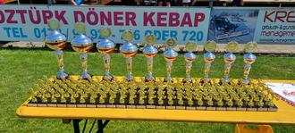 Die Siegerehrung nahm Jugendleiter Jörg Hahn vor, der in glückliche Kinderaugen schauen konnte. Jeder Spieler bekam nämlich einen kleinen Pokal überreicht. Große Pokale (E und F) sowie einen Jubiläumswimpel bekam noch jedes Team je nach Platzierung sortiert.