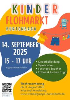 Am Sonntag, den 14.09.2025 von 15:00 - 17:00 Uhr veranstalten die Krabbelgruppen Burtenbach wieder einen Flohmarkt für Kinderbekleidung, Spielsachen und sonstiges Zubehör in der Burggrafenhalle Burtenbach. Kaffee und Kuchen to-go werden vor Ort verkauft! Infos und Anmeldung unter: www.krabbelgruppe-burtenbach.de