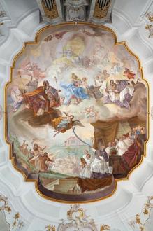 Das Deckenfresko der Kirche St. Nikolaus in Hammerstetten zeigt lebendige Ausschnitte aus der Lebenswelt des 18. Jahrhundert.