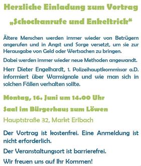 Vortrag „Schockanrufe und Enkeltrick“ in Kooperation mit dem Seniorenbeauftragten und dem Seniorenbeirat. Der Seniorenbeirat reicht Kaffee und Kuchen / Getränke.