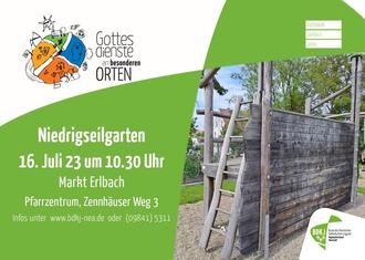 Einen Gottesdienst im Niedrigseilgarten feiert der Bund der Deutschen Katholischen Jugend (BDKJ) Regionalverband Neustadt am Sonntag, 16. Juli 2023, im Niedrigseilgarten Maria Namen hinter der Katholischen Kirche in Markt Erlbach und führt damit die Reihe seiner „Gottesdienste an besonderen Orten“ fort.