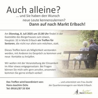 Nach dem schönen ersten Zusammenkommen möchten wir uns wieder treffen! Sie haben auch den Wunsch neue Leute kennenzulernen? Bei diesem Treffen gibt es die Möglichkeit mit Anderen ins Gespräch zu kommen und neue Kontakte zu knüpfen. Somit soll der Einsamkeit im Alter etwas entgegengesetzt werden. Das Treffen wird koordiniert von Herrn Ochs. Bei Fragen können Sie sich gerne an Herrn Ochs unter Tel.: 09161 / 8733934 wenden oder Sie kommen einfach vorbei!