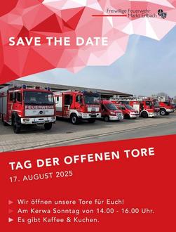 Wir laden Sie herzlich ein, unsere Feuerwehr am Kirchweihsonntag, den 17. August 2025, von 14:00 Uhr bis 16:00 Uhr zu besuchen.