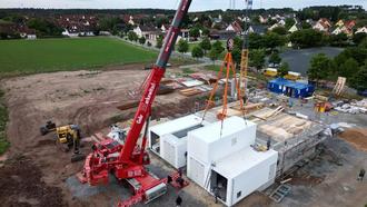 In der letzten Juli-Woche wurden mittels Schwerlasttransporten wichtige Bauteile für die Energiezentrale angeliefert. Ganze Gebäudemodule sowie zwei Heizkessel konnten an einem Kran schwebend an die vorgesehenen Stellen platziert werden.