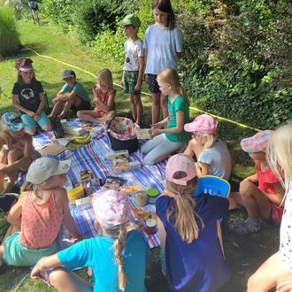 Mit diesem Motto ließen sich beim Ferienprogramm 16 Kinder ansprechen. Unter einem bunten Fallschirm wurde gleich deutlich, dass die bunte Gruppe aus Kindern auch viele Gemeinsamkeiten hat. Aus den Plakaten an der Fairen Schlange erfuhren sie viel Wissenswertes über den Fairen Handel und das Faire Miteinander in Markt Erlbach und weltweit. Simone Bader und Irmi Bauereiß initiierten ein Ballspiel mit einem Fairen Fußball sowie zahlreiche Rate- und Suchspiele. Aus einem großen Lebensmittelkorb durften die Kinder faire Produkte für ein Faires Frühstück auswählen und genießen. Dabei war klar, dass auch die Milch von heimischen Kühen, das Brot vom Markt Erlbacher Bäcker, die selbstgemachte Erdbeermarmelade aus deutschen Erdbeeren oder der Honig von der ortsansässigen Imkerin faire Produkte sind, die auf den Tisch dürfen. Zusammen mit dem Orangensaft aus Fairem Handel, der fair gehandelten Trinkschokolade und dem Tee aus dem lokalen Einzelhandel ließ sich ein leckeres Frühstück zaubern - ganz ohne schlechtes Gewissen! Mit den frisch bemalten Steinen ist die Faire Schlange nun auf 57 Meter angewachsen. Bis zum 21. September können noch Steine angelegt und bewundert werden. Dann setzt die Schlange sich in Bewegung. Einige Kinder wollen auch dann dabei sein und ihre Ideen für ein Faires Miteinander in Markt Erlbach, die sie auf Papier gemalt haben, mitbringen.