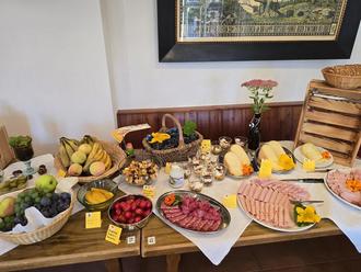 Wie vielfältig und köstlich fair gehandelte und regionale Lebensmittel sein können, davon konnten sich die Gäste ganz praktisch überzeugen. Auf dem Buffet fanden sich regionale Wurst- und Käsespezialitäten, Brot und Brötchen von der Bäckerei Schindler direkt gegenüber, selbstgemachte Marmeladen und herzhafte Aufstriche, verschiedene Müslis, frisches Obst, hausgemachte Kuchen und Gebäck – natürlich alles mit fair gehandeltem Zucker, regionalem Mehl, Eiern und Milch zubereitet. Wer wollte, bekam sein Frühstücksei sogar frisch zubereitet.