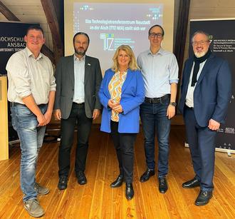 Bild von links nach rechts: Rüdiger Eisen, Wirtschaftsförderer Stadt Neustadt a.d.Aisch, Michael Capek, Wirtschaftsförderer Landratsamt Neustadt a.d.Aisch, Dr. Birgit Kreß, 1. Bürgermeisterin Markt Erlbach, Prof. Dr. Schacht, Hochschule Ansbach, Prof. Dr.-Ing. Müller-Feuerstein, Präsident Hochschule Ansbach