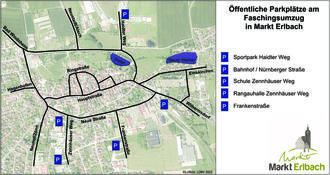 Rund um den Faschingsumzug und den anschließenden Kehraus stehen ausreichend Parkplätze zur Verfügung. Eine Übersicht finden Sie in der folgenden Grafik.