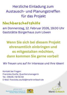 Zudem möchte ich Sie zu den kommenden Treffen, Begegnungsangeboten und Vorträgen im Februar/März herzlich einladen und freue mich Sie dort zu begrüßen. Nutzen Sie gerne für die Hin- und Rückfahrt zu den Angeboten kostenlos (Spenden zum Unterhalt des Busses sind gerne willkommen) den Markt Erlbacher Bürgerbus. Sie können Ihre Fahrt reservieren unter Tel.: 09106 / 929394.