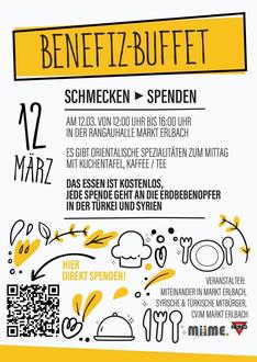 Die Not in Syrien und Türkei durch das Erdbeben ist groß und wir in Markt Erlbach sind bereit zu helfen. Syrische und Türkische Mitbürger, CVJM und MiiME möchten ein Benefiz-Buffet am Sonntag, den 12. März ab 12Uhr in der Rangauhalle veranstalten. Es werden köstliche orientalische Spezialitäten und einen Kuchentafel angeboten. Herzlich willkommen zum Schmecken, wir freuen uns auf eure großzügige Spende für die Erdbebenopfer. Eintritt ist frei.
