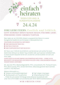 | 14.30 Uhr | 2. Lichtblick der Dekanatsfrauen Neustadt: : "Alt werden und jung bleiben" - Beobachtungen, Erfahrungen und Ausblicke : Vortrag von Christoph Zehendner bei Kaffee & Kuchen mit anschließendem Austausch |