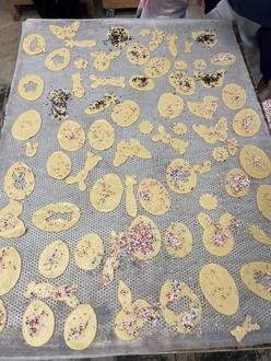 Nun waren wir bereit zum Plätzchen-Backen. Der Teig war schon vorbereitet und wurde mit einer großen Walze ausgerollt. Das ging echt schnell und wir konnten mit dem Ausstechen beginnen. Es gab viele Ausstecher zum Thema Ostern & Frühling. Auf drei großen Backblechen haben die Kinder die ausgestochenen Plätzchen gelegt. Als der Bäcker uns erzählte, dass die Plätzchen jetzt nass gemacht werden, konnte die Kinder dies erst nicht glauben. Doch mit einem feinen Wasserstrahl wurden die Plätzchen angefeuchtet, sodass die Streusel besser darauf haften. Alle Kinder haben viele bunte Streusel auf den Plätzchen verteilt.