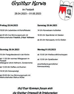 von Freitag, den 28. April bis einschließlich Montag, den 01. Mai 2023 feiern unsere Ortsteile Jobstgreuth und Wilhelmsgreuth ihre Kirchweih.