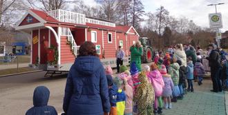 Bei uns zogen nämlich über diese Zeit die Super- und Alltagshelden ein. Wir feierten Fasching, und das eine ganze Woche lang! Schon ab Montag ging es unter dem Thema: „Kunterbunte Heldenwoche“ los. Dabei mussten die Kostüme allerdings noch warten, denn wir kamen im Pyjama. So ließ es sich in der toll geschmückten Turnhalle gut für das Faschingskino aushalten. Damit aber auch das Verkleiden ganz besonders zur Geltung kommen konnte, gab es am Dienstag einen Faschingslaufsteg, auf dem die Kostüme zu Musik präsentiert wurden. Bei unserem traditionellen Krachumzug machten wir dann Fischach unsicher. Die Krippenkinder überraschten uns im Kindergarten und die Kindergartenkinder besuchten Herrn Pfarrer Dr. Schrom, das Rathaus, die Metzgerei Hauser und die Lesehexe. Dabei sangen wir unsere Faschingslieder und zeigten den vorher einstudierten „Heldentanz“. An jeder der Stationen bekamen die Kinder auch eine kleine Überraschung, zum Essen oder zum Mit-nach-Hause-nehmen. Dafür sagen wir ganz herzlich Danke! Natürlich organisierten die Gruppen auch selbst verschiedene spannende Aktivitäten wie zum Beispiel das Kinderschminken, eine Polonaise durch die Krippe oder besondere Kreisspiele für den Mittagskreis. Der Höhepunkt des Faschingstreibens war aber definitiv das leckere Faschingsbuffet, das unser Elternbeirat wieder liebevoll angerichtet hatte. Ein weiteres Highlight an diesem Tag war der Besuch des Fischacher Faschingswagens. Zu guter Musik haben wir zusammen getanzt und erhielten eine exklusive Tour durch das Wageninnere.