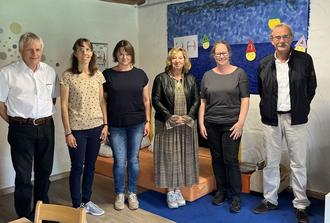 Von rechts nach links stehend auf dem Bild: Bürgermeister Peter Ziegelmeier, Bettina Fürst, Trägerbeauftragte Pädagogik Claudia Haßmann, Nicole Kohlmus, Margit Lützel, Trägerbeauftragter Rolf Petermann.