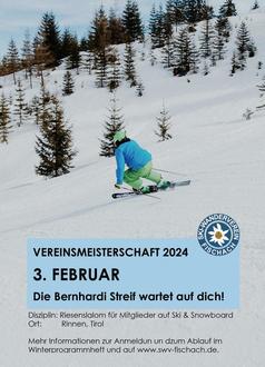 Die alljährliche Vereinsmeisterschaft steht vor der Tür und läd alle Mitglieder des Ski- und Wandervereins nach Rinnen auf die Bernhardi-Streif ein! Der Riesentorlauf ist dabei für Groß und Klein gut machbar und für die jüngsten Rennfahrer gibt es einen verkürzten Start. Nähere Infos zum Ablauf und zur Anmeldung gibt es auf der Vereinshomepage unter www.swv-fischach.de
