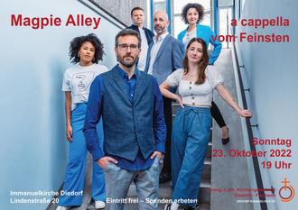 | 19.00 Uhr | Magpie Alley chr('8211'); a cappella vom Feinsten, Immanuelkirche Diedorf (mit Pfr. Alan Büching) 6-köpfige A-cappella-Gruppe "Magpie Alley" mit Alexandrina Simeon und Martin Sailer (greg is back) |