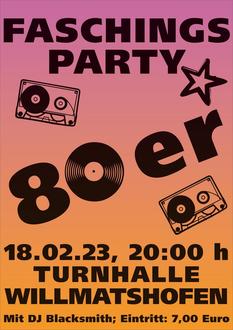 Kommt alle zu unserer Faschingsparty! Unser Motto in diesem Jahr sind die 80er Jahre. Dementsprechend wird die Willmatshofer Turnhalle dekoriert sein.