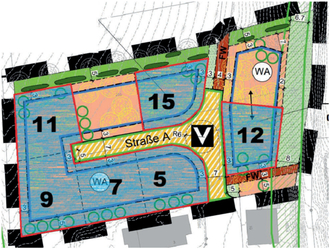 Zur Auswahl stehen alle noch verfügbaren sechs Bauplätze (Hausnummern 5 mit 516 m², Nr. 7 mit 518 m², Nr. 9 mit 615 m², Nr. 11 mit 533 m², Nr. 12 mit 506 m² und Nr. 15 mit 495 m²).