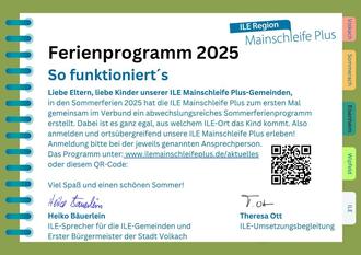 In diesem Jahr gibt es erstmals für alle Kinder aus den ILE-Orten ein gemeinsames, ortsübergreifendes Ferienspaß-Programm. Daran können alle Kinder aus den ILE-Orten Volkach, Sommerach, Nordheim, Eisenheim, Wipfeld, Schwanfeld und Kolitzheim teilnehmen.