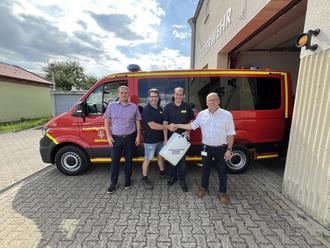 Übergabe des Schwimmsaugers an die Feuerwehr Wipfeld (v.l. Bürgermeister Tobias Blesch, 1. Kommandant Philipp Volk, 2. Kommandant Maximilian Löber, Michael Scherl (VKB)