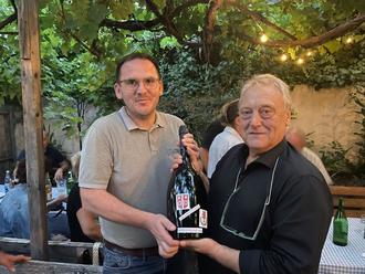 Im Bild überreicht Follinas Bürgermeister Mario Collet seinem Wipfelder Amtskollegen Tobias Blesch eine Magnumflasche Prosecco mit den Wappen der beiden Gemeinden.