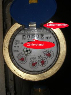 Sollten sich auf Ihrem Grundstück mehrere (Haupt-)Zähler oder Garten-, Zisternen- oder Brunnenzähler befinden, werden alle Zählerstände benötigt. Bitte beachten Sie, dass der Zählerstand fünfstellig ist und ohne Kommastellen mitgeteilt werden muss. Wo sich Zählerstand und Zählernummer auf Ihrer Wasseruhr befinden können Sie der Abbildung entnehmen.