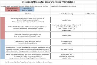 Die Gemeinde Wipfeld veräußert das Wohnbaugrundstück Thiergärten 5 mit einer Fläche von 516 m² im Geltungsbereich des Bebauungsplans Thiergärten II unter Anwendung der nachfolgend veröffentlichen Vergaberichtlinie. Der Grundstückspreis einschließlich der gemeindlichen Erschließungskosten (Straße, Kanal, Wasser) beträgt voraussichtlich ca. 155 €/m².