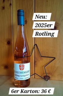 Unser 2025er Rotling aus dem Gemeewengert ist eingetroffen – handgelesen, halbtrocken und mit großer Sorgfalt von engagierten Bürgerinnen und Bürgern am Wipfelder Kirchberg erzeugt. Der Wein ist ein Cuvée aus Bacchus- und Spätburgundertrauben, die gemeinsam gekeltert wurden. Daraus entstand ein Wein, der die Frische des Bacchus mit der feinen Frucht des Spätburgunders harmonisch verbindet.