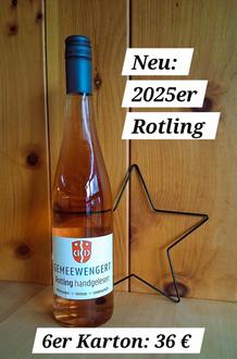 Unser 2025er Rotling aus dem Gemeewengert ist eingetroffen – handgelesen, halbtrocken und mit großer Sorgfalt von engagierten Bürgerinnen und Bürgern am Wipfelder Kirchberg erzeugt. Der Wein ist ein Cuvée aus Bacchus- und Spätburgundertrauben, die gemeinsam gekeltert wurden. Daraus entstand ein Wein, der die Frische des Bacchus mit der feinen Frucht des Spätburgunders harmonisch verbindet.