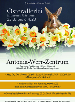 Am Mittwoch findet kein Verkauf statt. Zusätzlich öffnet der Verkauf am Sonntag, 2. April nach dem Gottesdienst in der Zeit von 11:00 - 14:00 Uhr. An diesem Tag besticken wir gerne Handtücher für Sie.