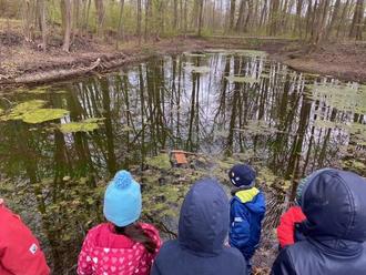 Die Löwengruppe des Kinderland Eicherloh - Am Park beobachtet derzeit ganz gespannt das Geschehen im Tümpel des angrenzenden Parks. Darin fanden sie Anfang April Froschlaich und fingen an, sich mit der Entwicklung des Frosches zu beschäftigen. Immer wieder gingen sie zum Tümpel um zu schauen, was so mit dem Laich passiert. Dabei konnten sie zum Beispiel beobachten, dass der Laich immer größer wurde. Nun ist der Laich nicht mehr zu finden, das bedeutet: Die Kaulquappen sind geschlüpft. Und mitten im Tümpel konnten wir eine Kröte beobachten, das war ganz schön spannend! Wir sind gespannt wie es mit der Froschentwicklung weitergeht.