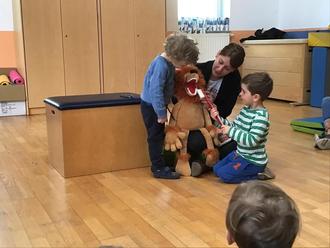 Zuerst durften die Kinder überlegen, welche Lebensmittel gut und welche eher schlecht für die Zähne sind. Nach intensiver Diskussion besprachen alle zusammen welche Stellen im Mund mit der Bürste geputzt werden müssen. Dabei wurde Leo, der Kuscheltier-Löwe, den Frau Kraus mitgebracht hatte, zum Patienten. An ihm durften die Kinder ausprobieren, wie Zähne richtig geputzt werden.